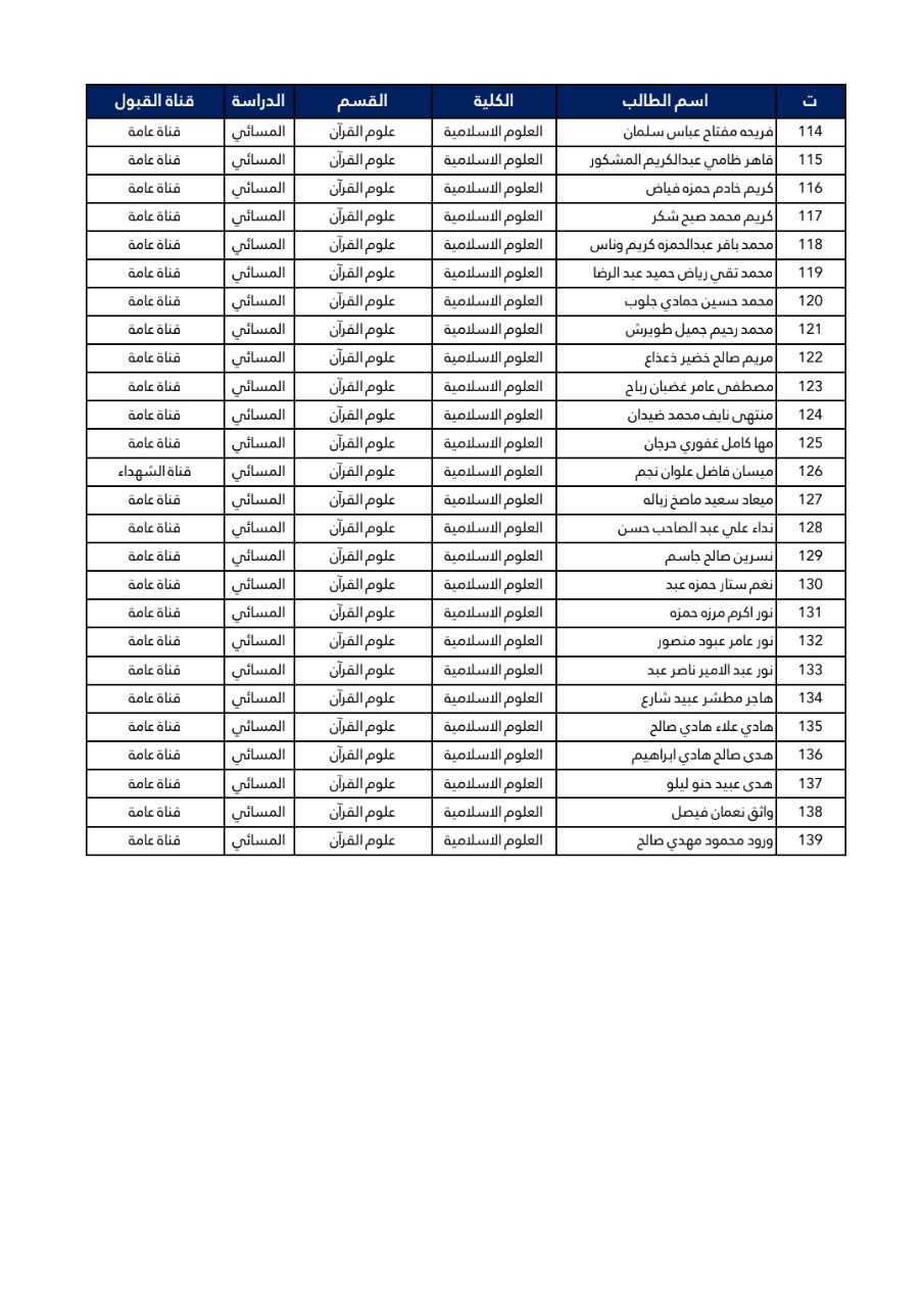 اسماء الطلبة المقبولين في كلية العلوم الاسلامية قسم علوم القرآن للعام 2024-2025