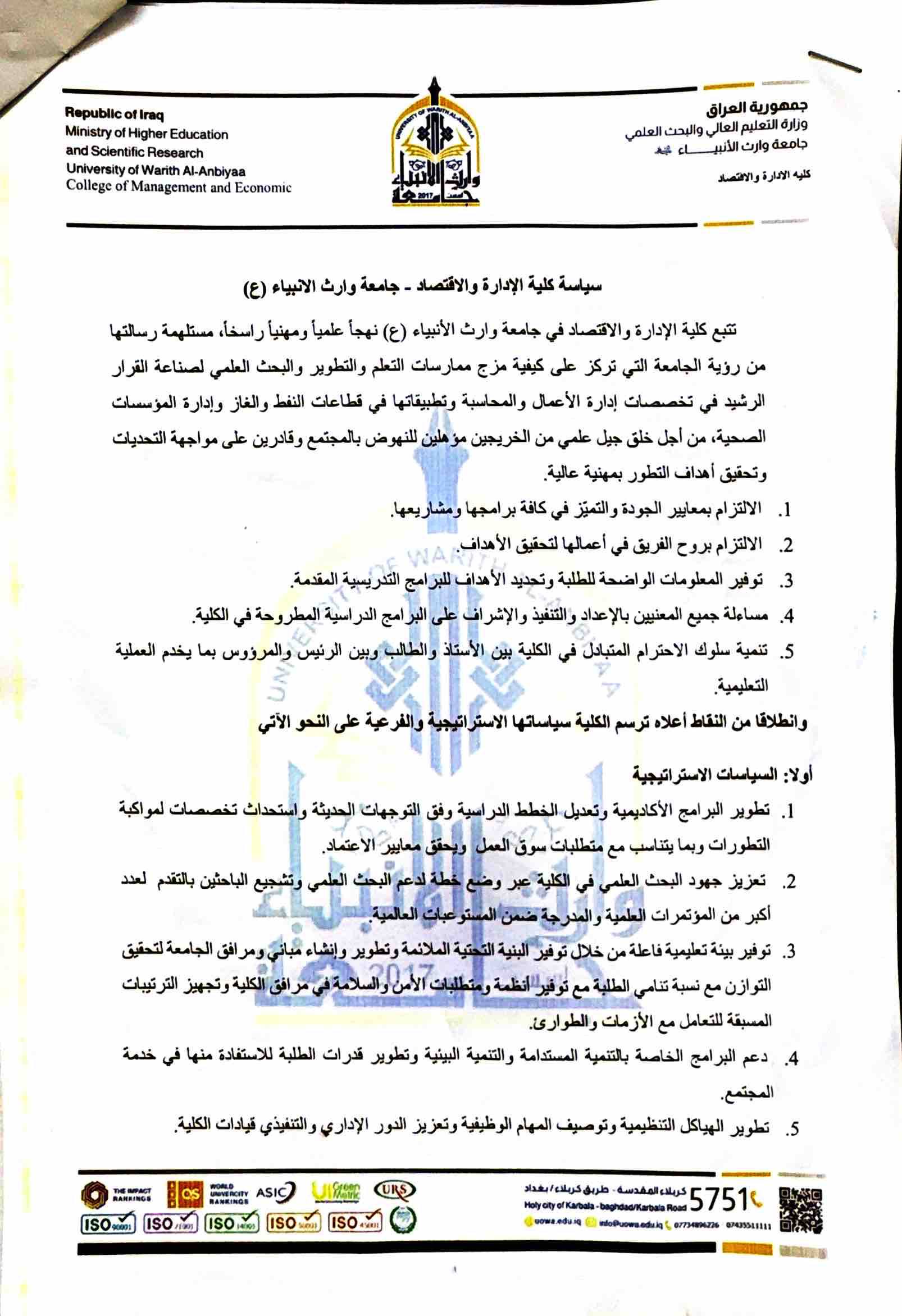 وانطلاقاً من النقاط اعلاه ترسم الكلية سياساتها الاستراتيجية والفرعية على النحو الآتي:
