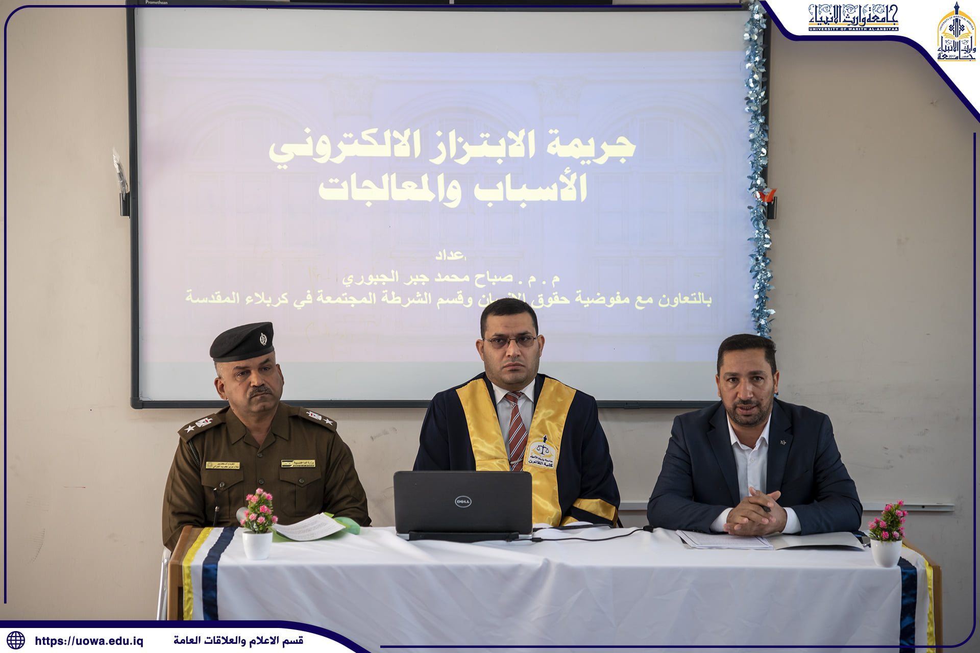 اقامت كلية القانون في جامعة وارث الانبياء (عليه السلام) وبالتعاون مع مفوضية حقوق الانسان والشرطة المجتمعية في كربلاء المقدسة ندوة تثقيفية بعنوان (جريمة الابتزاز الالكتروني الاسباب والمعالجات)