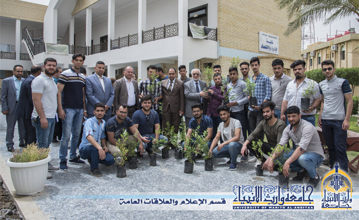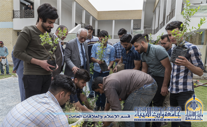 طلبة كلية الادارة والاقتصاد مع رئيس الجامعة أ .د طالب الموسوي يتشاركون غرس شتلات الاشجار في حدائق جامعة وارث الانبياء عليه السلام لتنمية القيم البيئية.