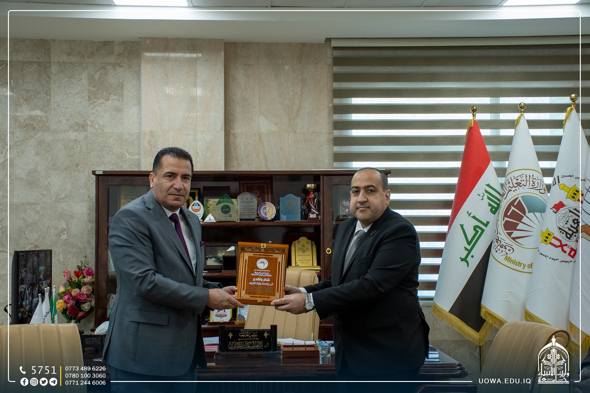 كرم معالي وزير التعليم العالي والبحث العملي الدكتور نعيم العبودي جامعة وارث الانبياء(عليه السلام) بدرع الشكر والتقدير قدمه للجامعة مستشار وزير التعليم الاستاذ الدكتور علاء عبد الحسن، تثميناً للجهود القيمة في استضافة "وفد وزارة التعليم العالي والبحث العلمي من خبراء مشروع تحديث مناهج دورات طرائق التدريس في الجامعات العراقية".