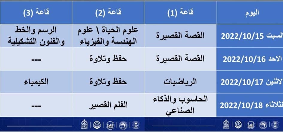 إليكم جدول مواعيد الاختبارات الأولية للمواهب والابتكارات الخاصة بالمسابقة، فعلى الطلبة الذين سجلوا في المسابقة الحضور مباشرة خلال المواعيد المذكورة في الجدول ادناه
