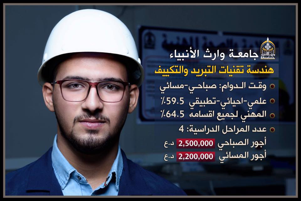 خفضت وزارة التعليم العالي والبحث العلمي العلمي الحدود الدنيا للقبول في الكليات والجامعات الأهليّة وأصبحت المعدلات المقبولة في جامعة وارث الانبياء (ع) كما يأتي :١- هندسة الطب الحياتي(علمي احيائي تطبيقي) ٧١.٥٢-هندسة مدني (علمي-تطبيقي)صباحي ٦٣.٥ والمسائي ٦١.٥٣-هندسة تقنيات التكييف والتبريد الصباحي والمسائي (للعلمي الاحيائي والتطبيقي )٥٩.٥اما بلنسبة للصناعة ٦٢.٥ للدراستين الصباحيةوالمسائية٤-التمريض (علمي احيائي اعدادية تمريض)٥٩.٥ ٥- القانون (علمي ادبي احيائي تطبيقي)الصباحي والمسائي ٥٦.٥٦- الادارة والاقتصاد -#المحاسبة و #ادارة الاعمال ( علمي ادبي احيائي تطبيقي تجارة عامة تجارة محاسبة تجارة ادارة اعمال ) للدراستين الصباحي والمسائي ٥٠٧- العلوم الاسلامية (القران والفقة واصولة ) علمي ادبي احيائي تطبيقي مهني اسلامي ٥٠٪