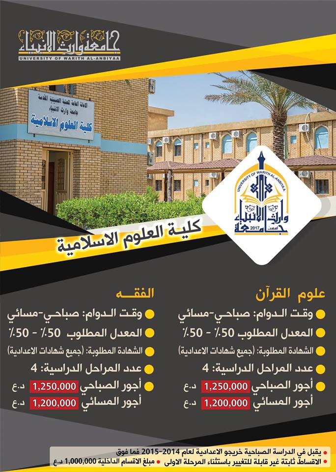 الى السادة خريجي معهد مفوضي الشرطة تعلن #جامعة_وارث_الانبياء عن توفر فرصه لقبولكم في كليتنا بالاقسام التاليه ((القانون - وادارة الاعمال - والمحاسبه - علوم قران - علوم فقه واصول الدين)) وللدراسات المسائية حصرا… المطلوب جلب عدم ممانعة من السيد وكيل وزارة الداخليه الاداري حصرا ووثيقة التخرج من المعهد وسيكون تقديمكم مع نافذه الدور الثالث .تمنياتنا لجميع طلبتنا التوفيق والنجاح.