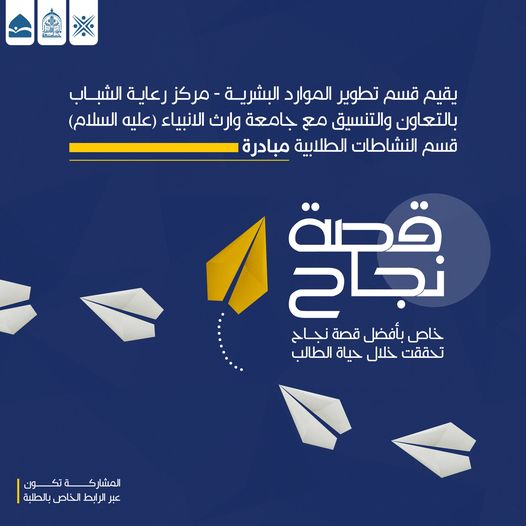 يقيم قسم تطوير الموارد البشرية/ مركز رعاية الشباب، بالتعاون والتنسيق مع جامعة وارث الأنبياء (عليه السلام)/ قسم النشاطات الطلابية مبادرة (قصة نجاح).