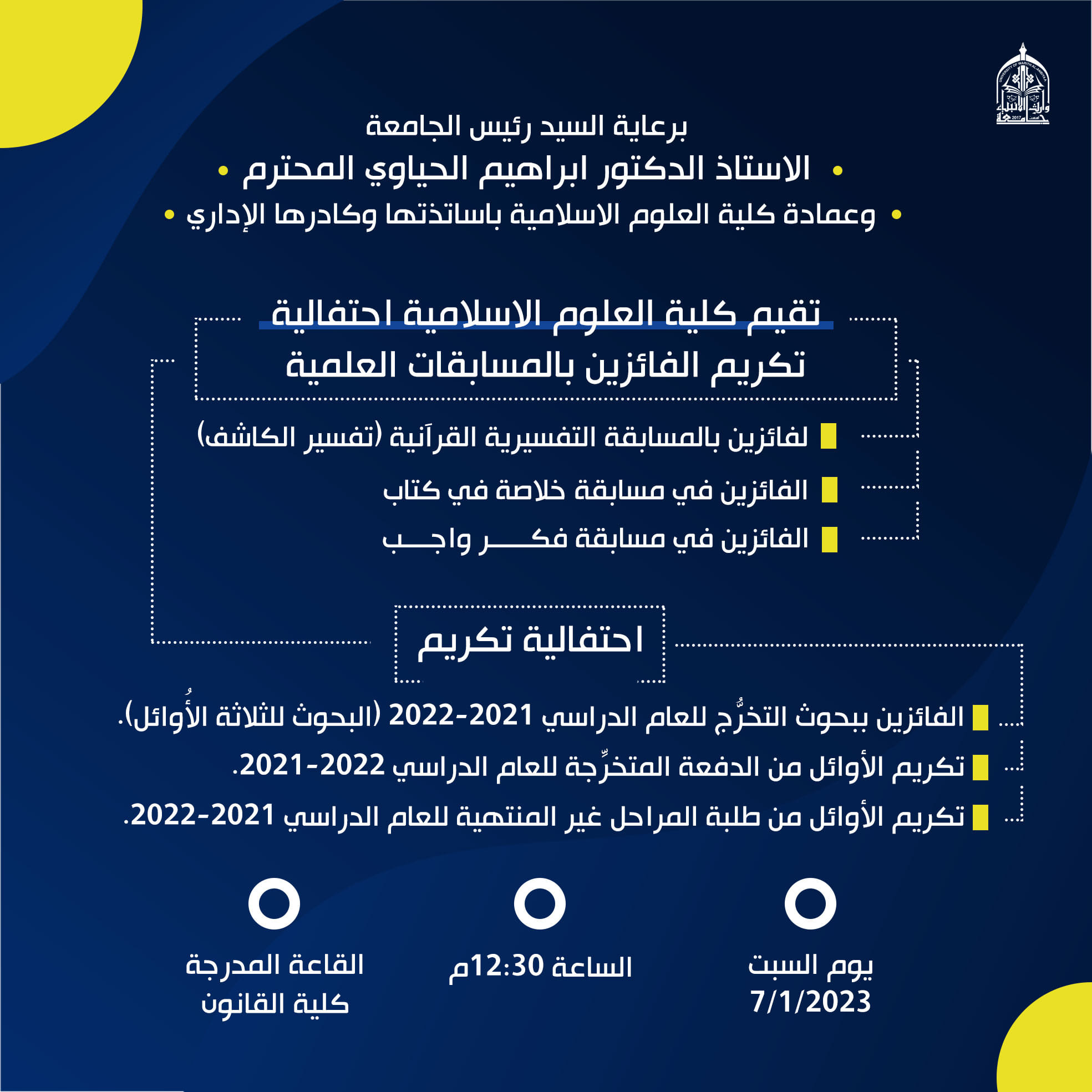 بعنوان (الإسلام حياة ) تحت شعار ( الهوية الإسلامية والتحديات المعاصرة) وبمشاركة جامعات من داخل العراق وخارجه يوم الاربعاء القادم المصادف 17/ 5/ 2023.