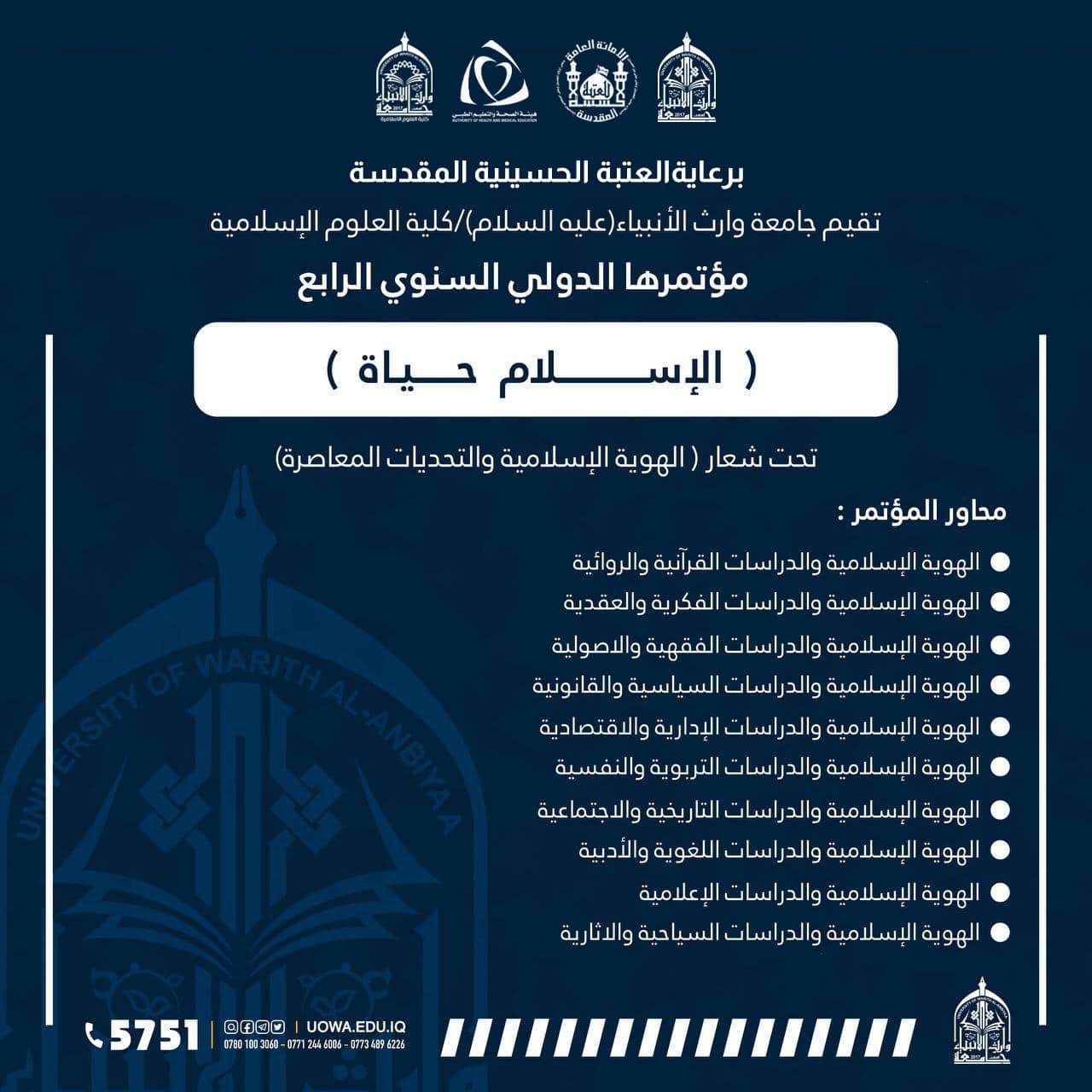تدعوكم رئاسة جامعة وارث الأنبياء(عليه السلام)/ كلية العلوم الإسلامية، لحضور "مؤتمرها الدولي السنوي الرابع " الذي يقام برعاية العتبة الحسينية المقدسة.