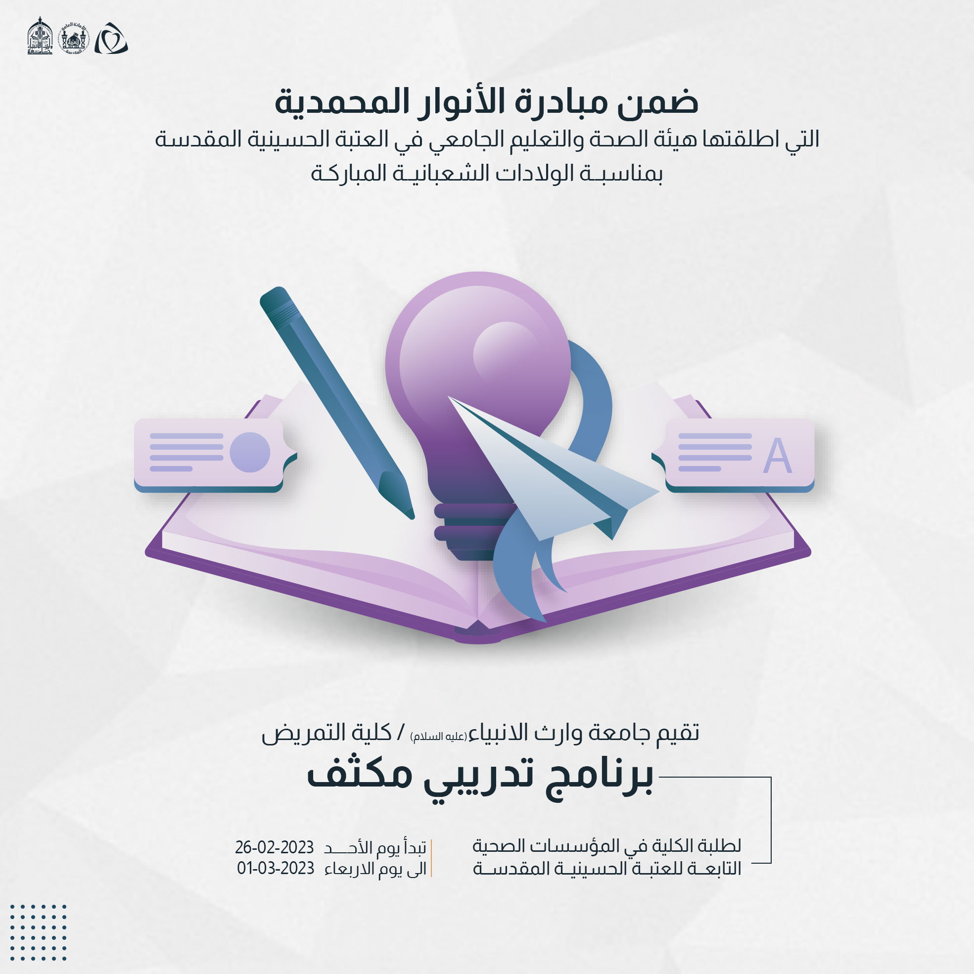 *يحصل المشاركون على شهادة مشاركة في الدورة صادرة من مركز التعليم المستمر/ جامعة وارث الانبياء(عليه السلام).
