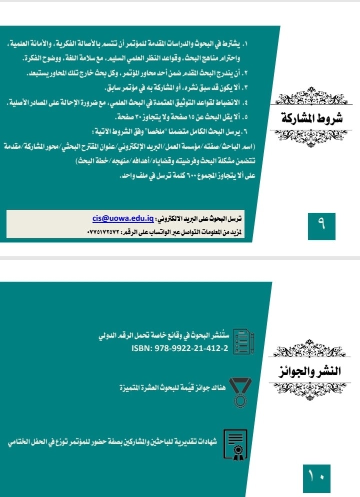 علماً ان البحوث المقبولة في المؤتمر ستنشر في كتاب خاص تحت عنوان وقائع المؤتمر يحمل تصنيف ISBN وهناك جوائز للبحوث المتصدرة بحسب محاور المؤتمر.