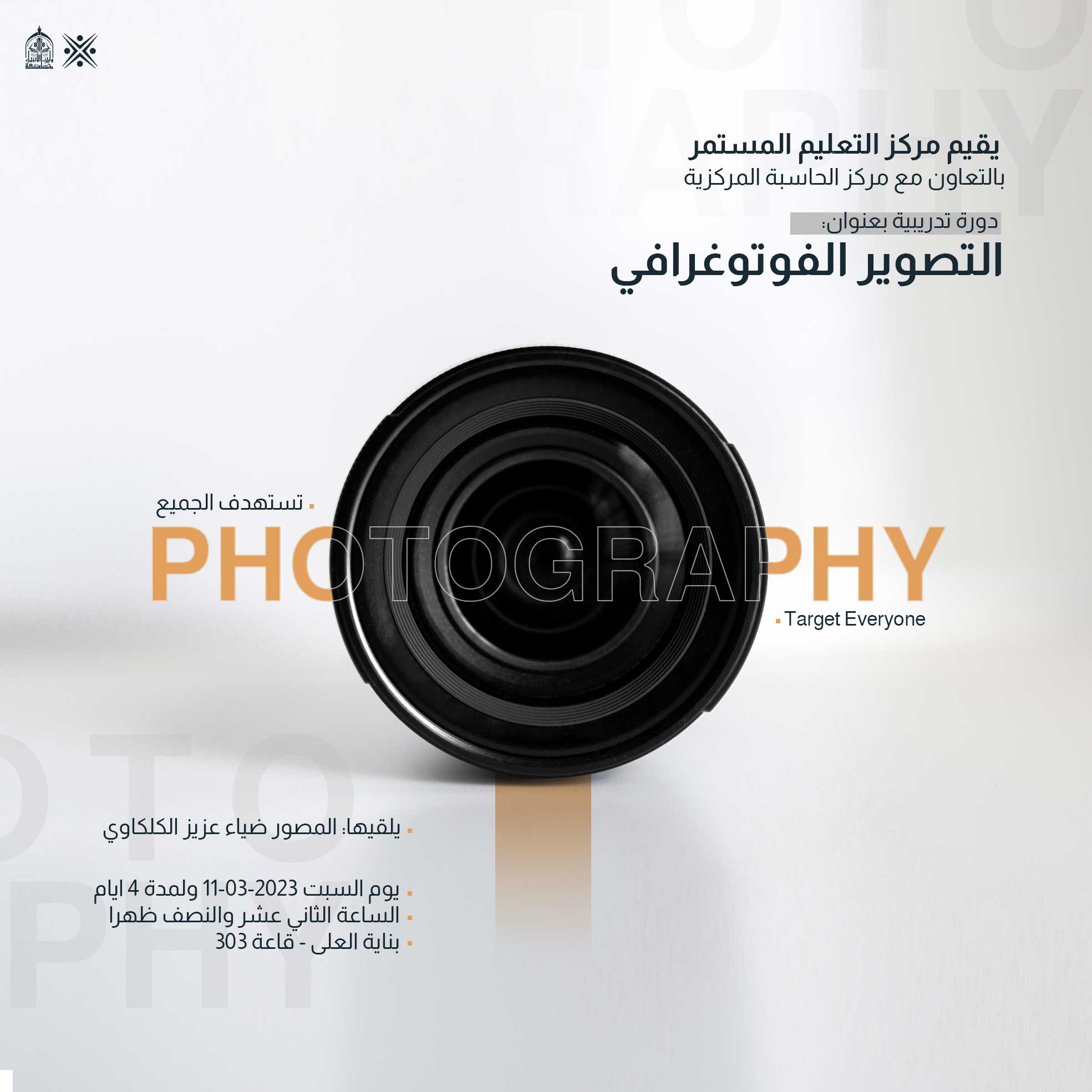 يعلن مركز التعليم المستمر في جامعة وارث الانبياء(عليه السلام) عن اقامة دورة التصوير الفوتوغرافي والتي تستمر لمدة اربع ايام يحاضر في الدورة المصور ضياء عزيز الكلكاوي.