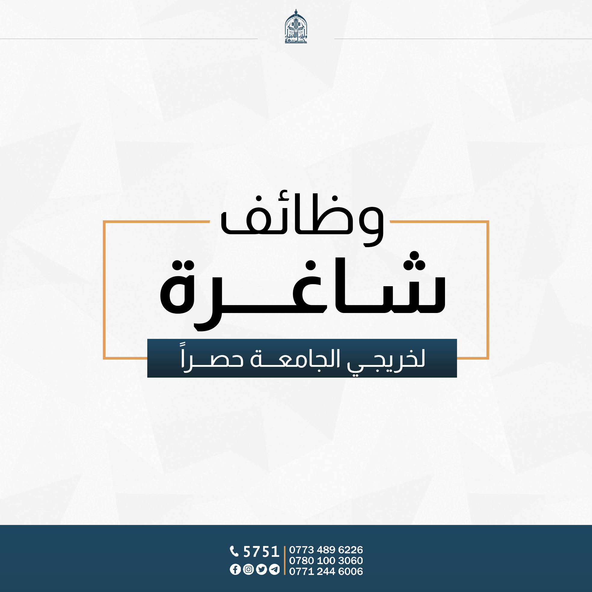 يعلن مركز التأهيل والتوظيف في جامعة وارث الانبياء(عليه السلام) عن وجود شاغر وظيفي في احدى الشركات (عدد 2) مخصص لخريجي جامعة وارث الانبياء(عليه السلام) (كافة اختصاصات الجامعة).