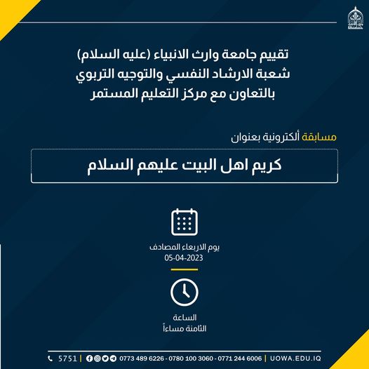 أقامت جامعة وارث الانبياء (عليه السلام)/ شعبة الارشاد النفسي والتوجيه التربوي وبالتعاون مع مركز التعليم المستمر مسابقة الكترونية تحت عنوان "مسابقة كريم أهل البيت (عليهم السلام)