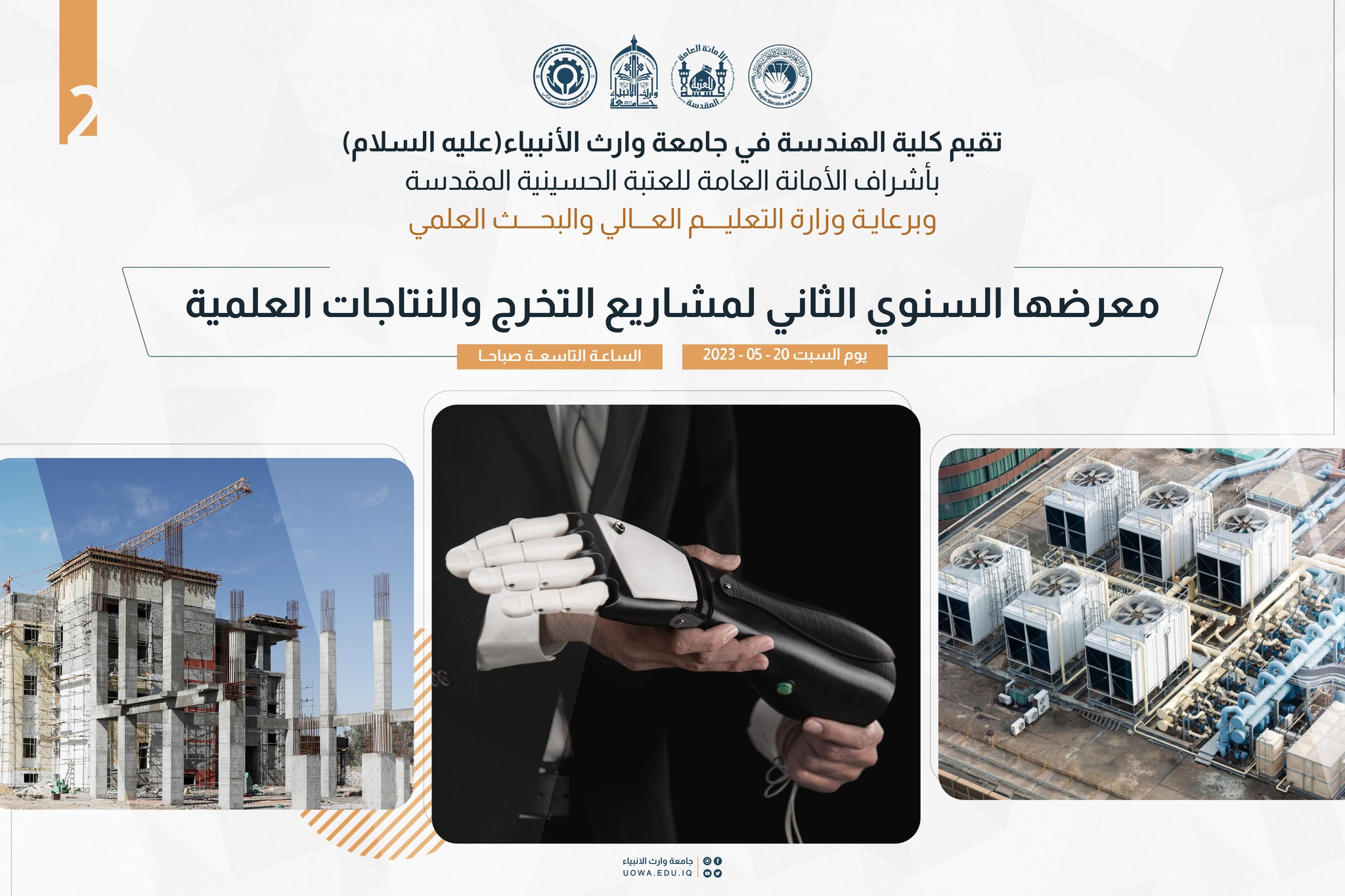 تدعوكم جامعة وارث الانبياء(عليه السلام) لحضور فعاليات "المعرض السنوي الثاني لمشاريع التخرج والنتاجات العلمية" لطلبة كلية الهندسة في العشرين من الشهر الجاري (20/5/2023) الساعة التاسعة (9:00) صباحاً.