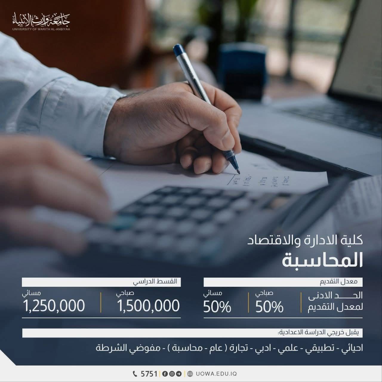 اكتشف مدخلات القبول والمعدلات المطلوبة لأقسام كليات الادارة والاقتصاد في جامعة وارث الانبياء (ع)