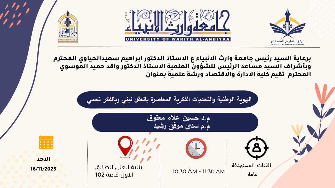 نظّمت كلية الإدارة والاقتصاد في جامعة وارث الأنبياء (عليه السلام) محاضرة خارجية في حدائق الجامعة، بمشاركة واسعة من الطلبة، بهدف كسر الروتين الدراسي وتعزيز التفاعل الأكاديمي.