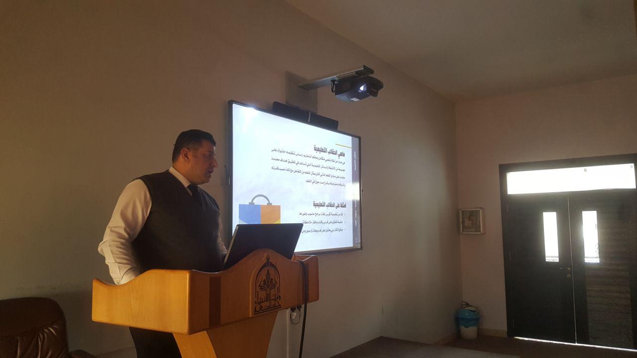 أقام قسم ادارة الاعمال في كلية الادارة والاقتصاد حلقة نقاشية بعنوان (الحقائب التعليمية) قام بألقائها الاستاذ (م.م علي عزيز) يوم الاربعاء المصادف 26\2\2018وقد حضر الجلسة كل من سيادة عميد الكلية أ.د.عامر العطوي و رئيس قسم المحاسبة م.د.فهد الشمري ورئيسة قسم ادارة اعمال م.د.نضال المالكي والسادة التدريسيين مع مجموعة من الطلبة وقد ركزت الورشة على توضيح مفهوم الحقائب التعليمية وطريقة انشائها وكيفية توظيفها لخدمة الجانب التعليمي لطلبة كليتنا