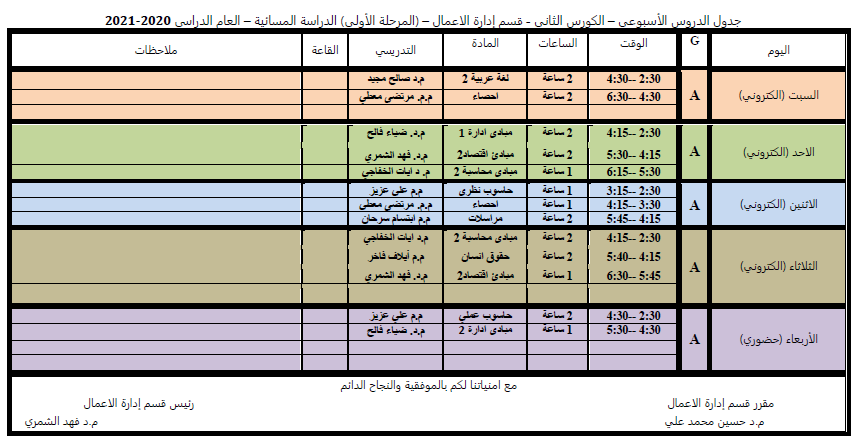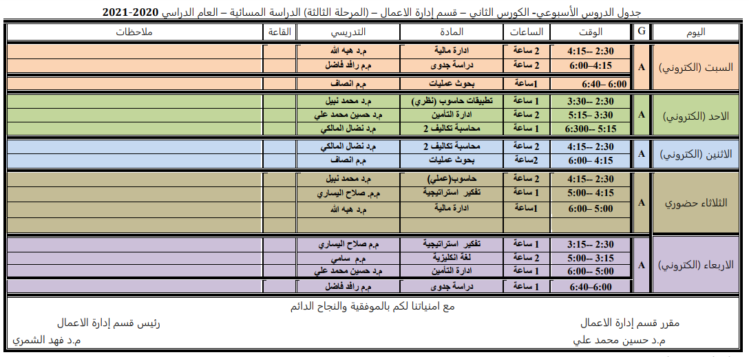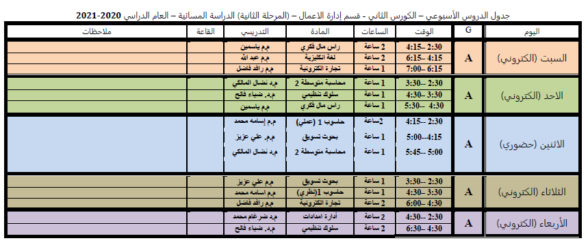جدول الدروس الاسبوعي للكورس الثاني لقسم ادارة الاعمال الدراسة المسائية