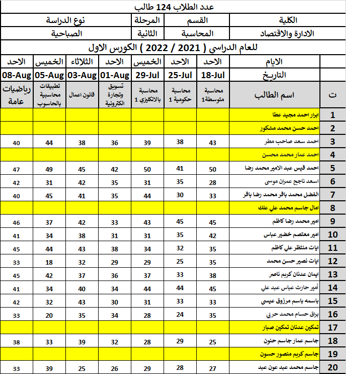 في حالة عدم ورود اسم الطالب ضمن قائمة السعي، يرجى مراسلة مقرر القسم "دكتور علي كيشوان"، علما ان حقول الدرجات الفارغة امام اسم الطالب تعني ان درجات الطالب قد تم "حجبها".