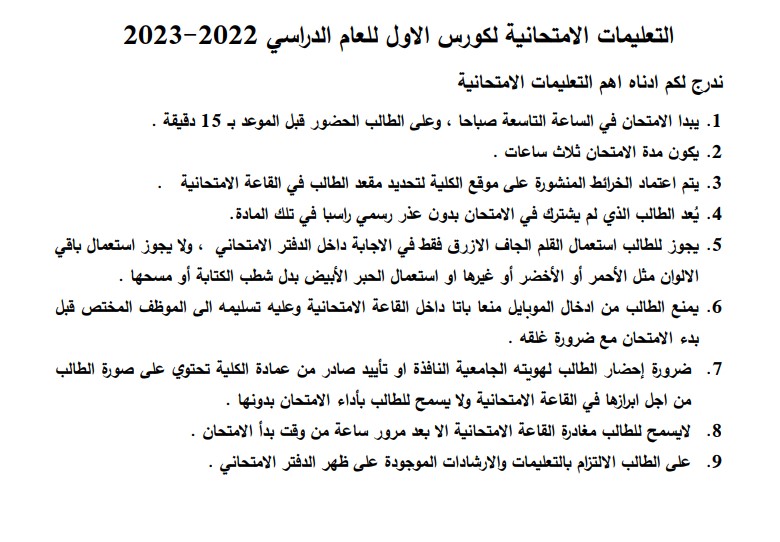 جدول امتحانات نهاية الكورس الاول لقسم ادارة الاعمال للعام الدراسي 2022-2023 للدراستين الصباحية والمسائية مع التعليمات .