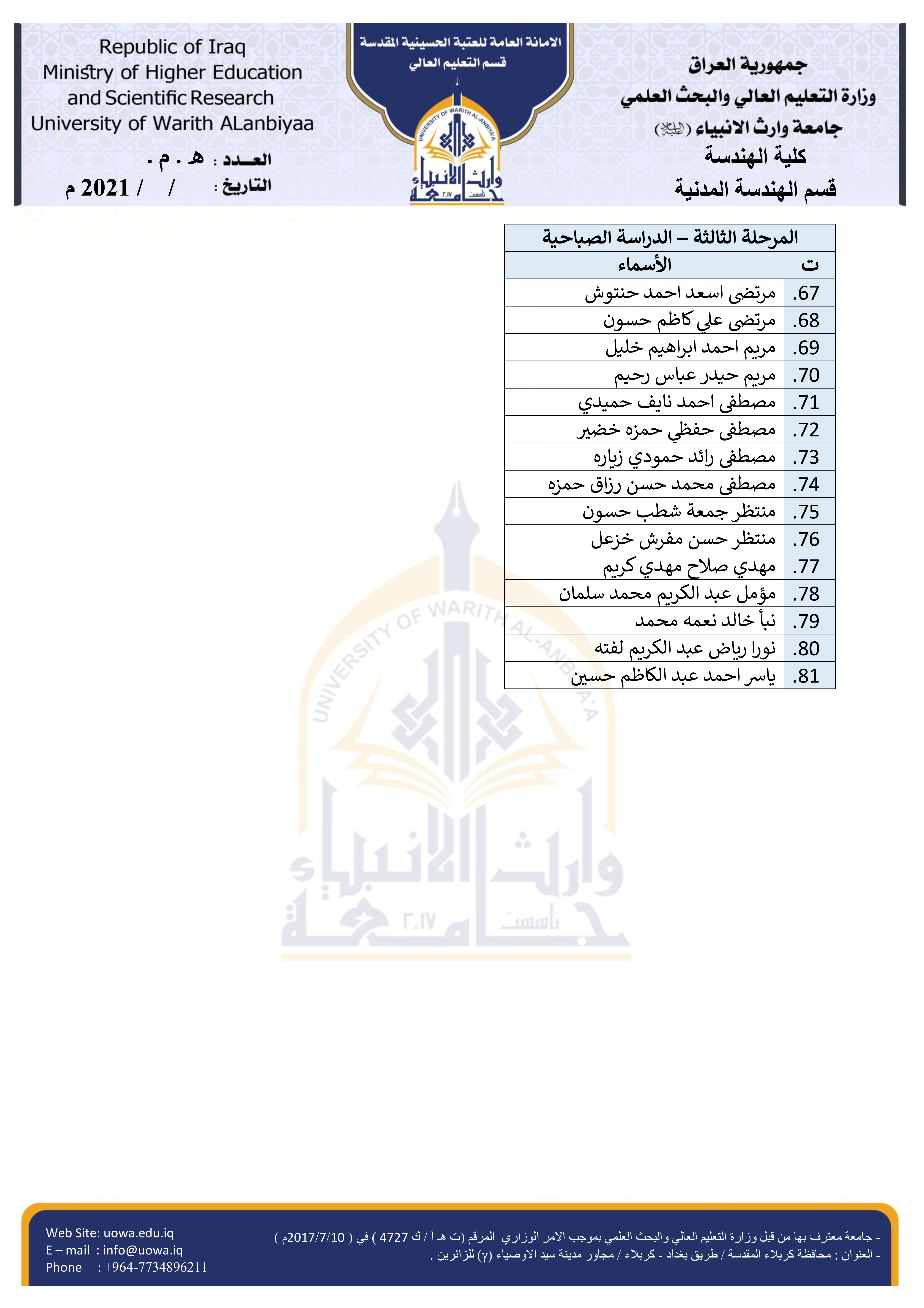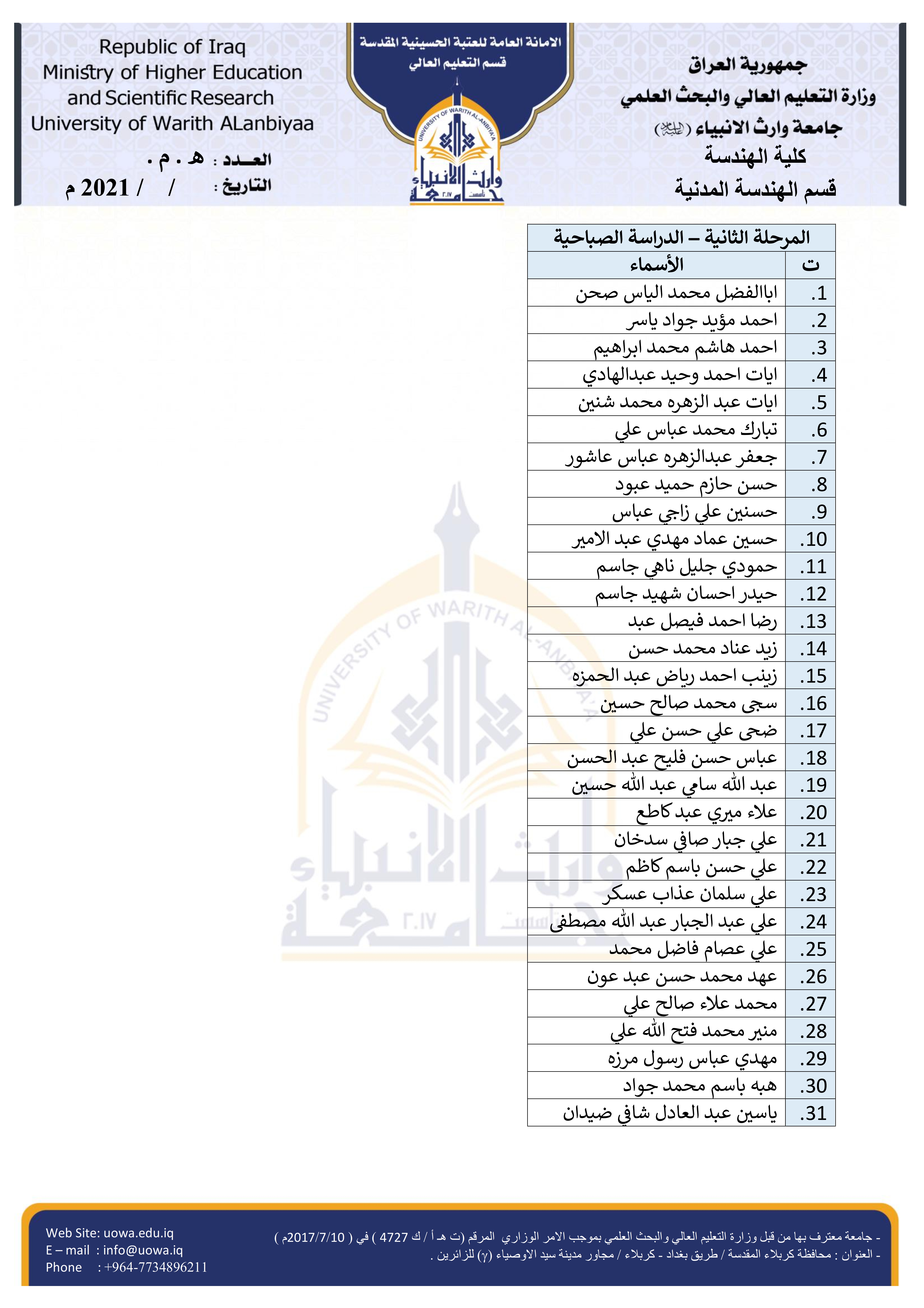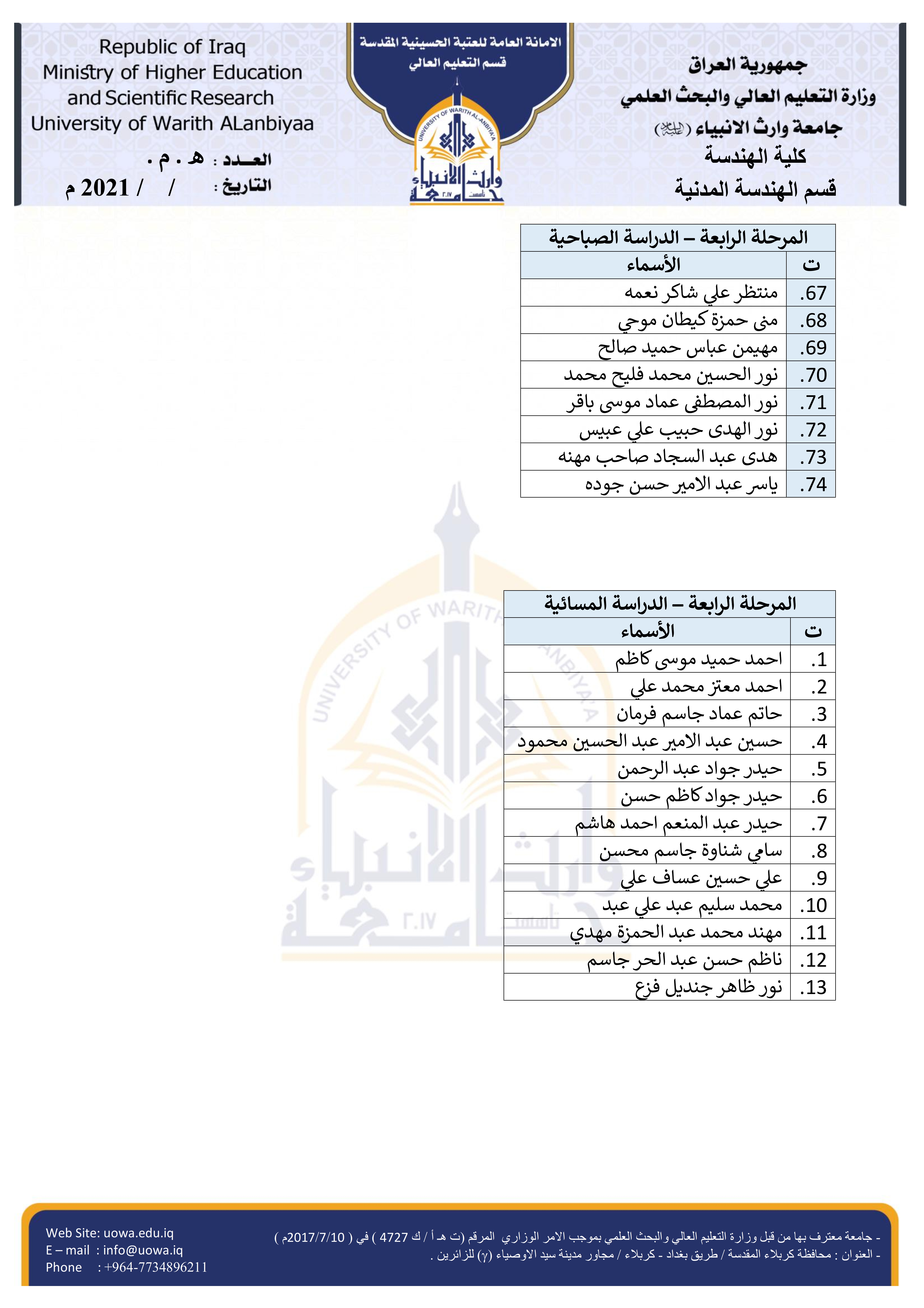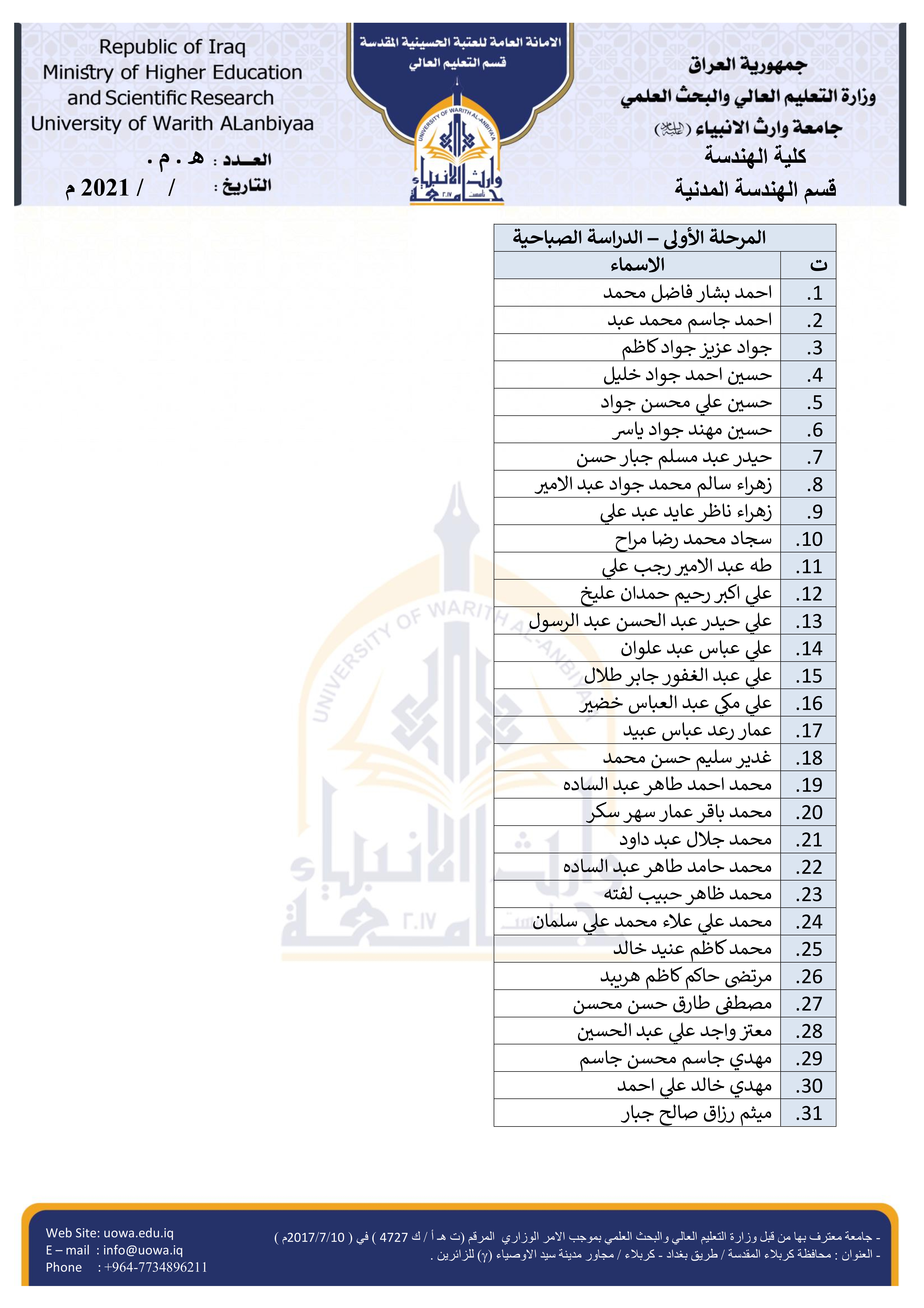 أدناه قوائم الأسماء الخاصة بالطلبة المشمولين بالامتحانات الحضورية لقسم الهندسة المدنية.