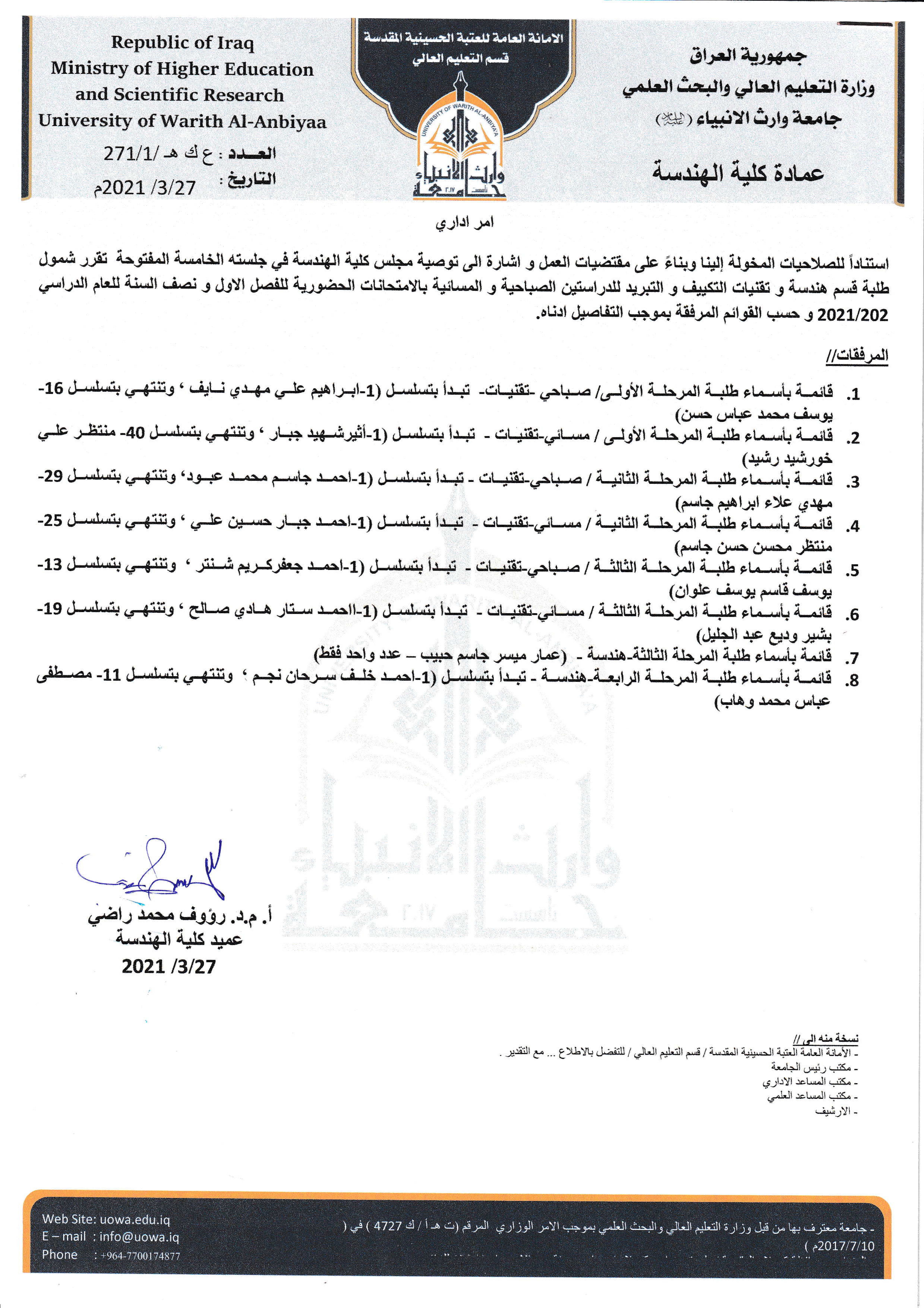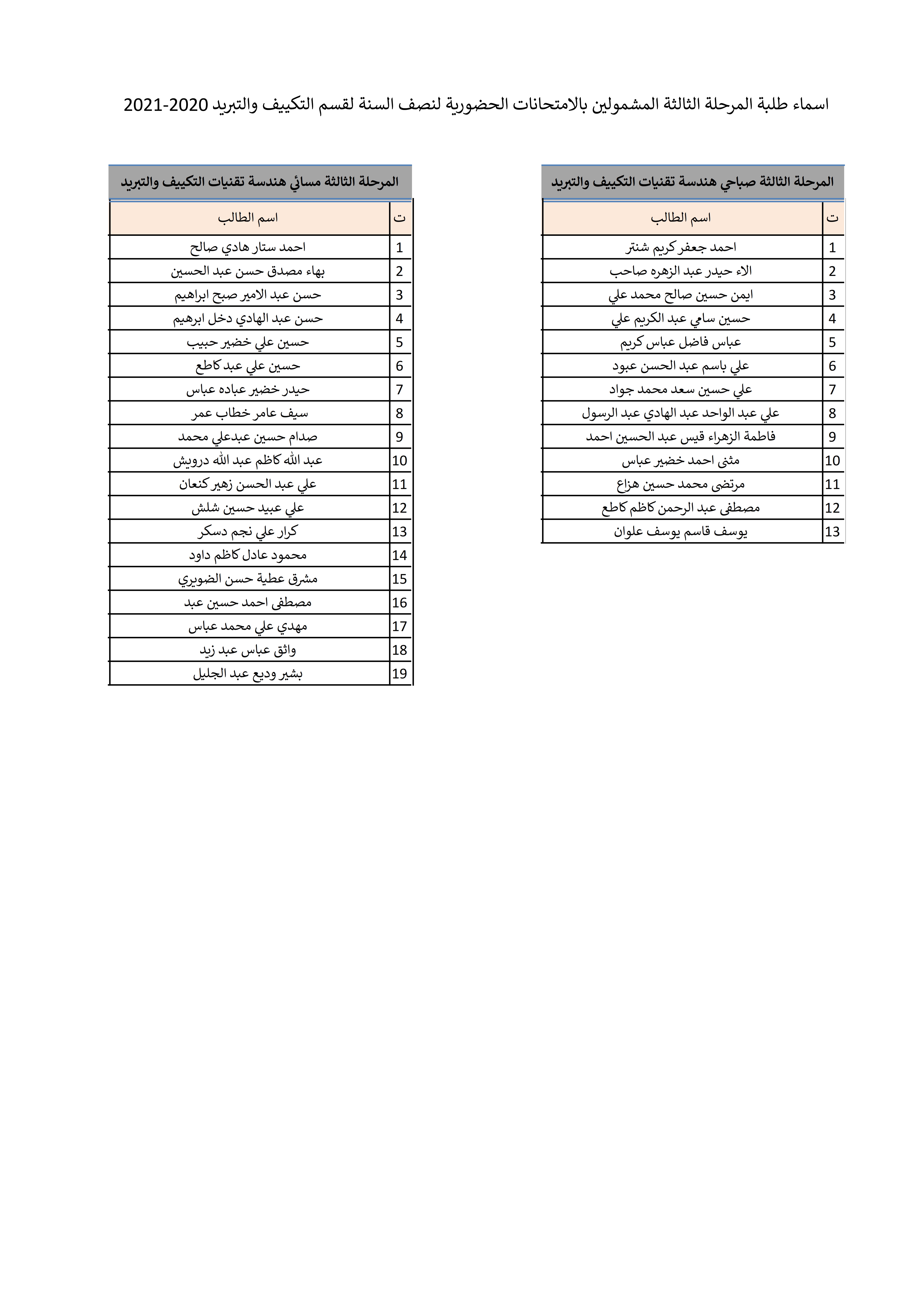 أدناه قوائم الأسماء الخاصة بالطلبة المشمولين بالامتحانات الحضورية لقسم هندسة تقنيات التكييف و التبريد.