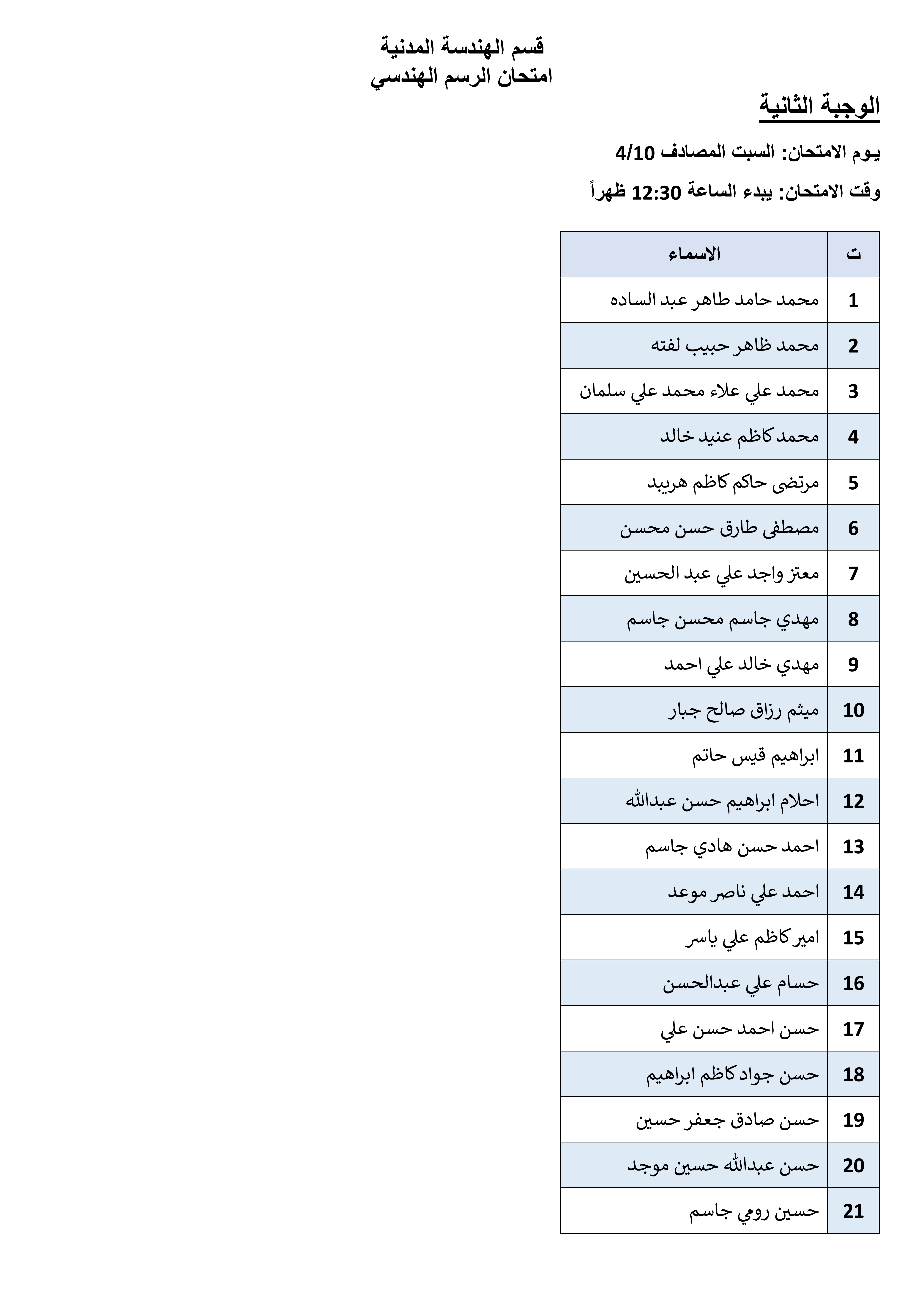 اسماء طلبة المرحلة الاولى في قسم الهندسة المدنية الخاصة بأمتحان الرسم الهندسي