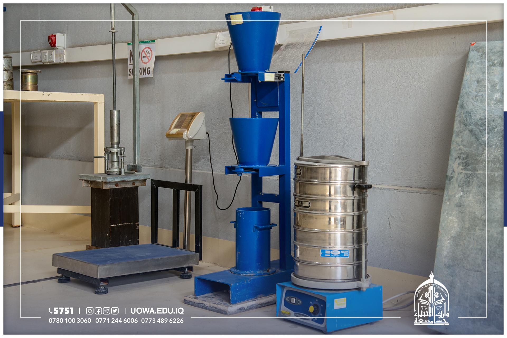 يعنى هذا المختبر بأجراء الفحوصات المختبرية للمواد الانشائية وكذلك الفحوصات المختبرية للإسمنت والمواد الخرسانية والركام (الرمل والحصى) وهذه الفحوصات ضرورية جدا لتمكن الطالب من معرفة كيفية خلط المواد مع بعضها البعض وبنسب معينه ودقيقه ومعرفة المشاكل التي تواجهه في حال لم يتم خلط المواد وفقا للنسب المحددة والظروف القياسية الملائمة التي تؤدي الى نجاح او فشل العينة ومدى مطابقتها للمواصفات الفنية من عدمه بالإضافة الى ذلك تمنح الفحوصات المختبرية دورا مهما يمكن المهندس من معرفة المادة الانشائية الجيدة وتمييزها والتي تؤدي الى زيادة عمر المنشأ