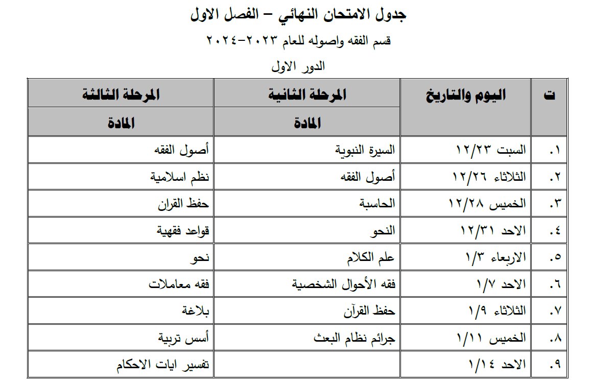 جدول الامتحانات النهائية للفصل الاول من العام الدراسي 2023-2024 قسم الفقه وأصوله