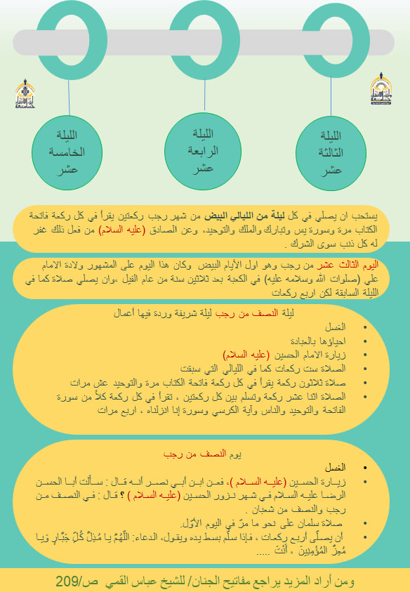 زيارة الحسين(عليه السلام)، فعن ابن أبي نصر أنه قال : سأَلت أبا الحسن الرضا عليه السلام في شهر نزور الحسين (عليه السلام ) ؟ قال : في النصف من رجب والنصف من شعبان .