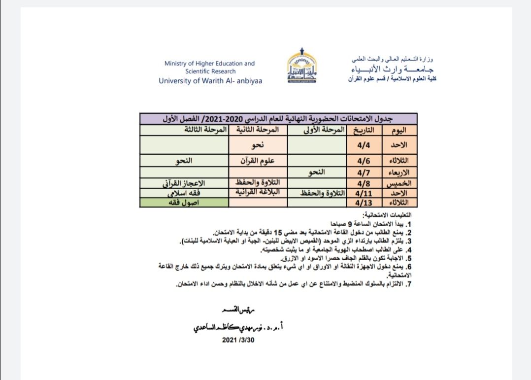ختام الامتحانات الالكترونية والحضورية لطلبة كلية العلوم الإسلامية / قسم الفقه واصوله _ وقسم علوم القرآن في يوم الثلاثاء الموافق ١٣ / ٤ /٢٠٢١