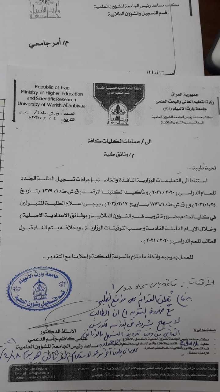 على الطلبة المدرجة أسماءهم ادناه جلب وثائقهم وتسليمها إلى قسم التسجيل علما أن آخر موعد لاستلامها هو بتاريخ ١٨ / ٤ / ٢٠٢١