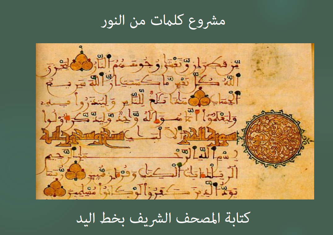 شرعت كلية العلوم الإسلامية في جامعة وارث الأنبياء بتنفيذ مشروع "كلمات من نور"، الذي يتضمن مشاركة أساتذة الجامعة وطلابها في خط نسخة كاملة من القرآن الكريم يدويًا، في مبادرة تهدف إلى تعزيز الارتباط بالكتاب الكريم وإحياء فن الخط العربي. حيث تم توزيع الباجات و اوراق كتابة ايات المصحف الكريم على المشاركين. ويجري العمل على المشروع بحماس كبير من قبل المشاركين، على أمل تحديد موعد رسمي للاحتفاء بهذا الإنجاز لاحقًا، تكريمًا للجهود المبذولة في إنجازه ونشرًا لقيم الاهتمام بالتراث الإسلامي.
