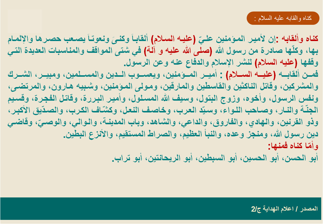 كناه وألقابه :إن لأمير المؤمنين عليّ (عليه السلام) ألقاباً وكنىً ونعوتاً يصعب حصرها والإلمام بها، وكلّها صادرة من رسول الله (صلى الله عليه و آلة) في شتى المواقف والمناسبات العديدة التي وقفها (عليه السلام) لنشر الإسلام والدفاع عنه وعن الرسول.