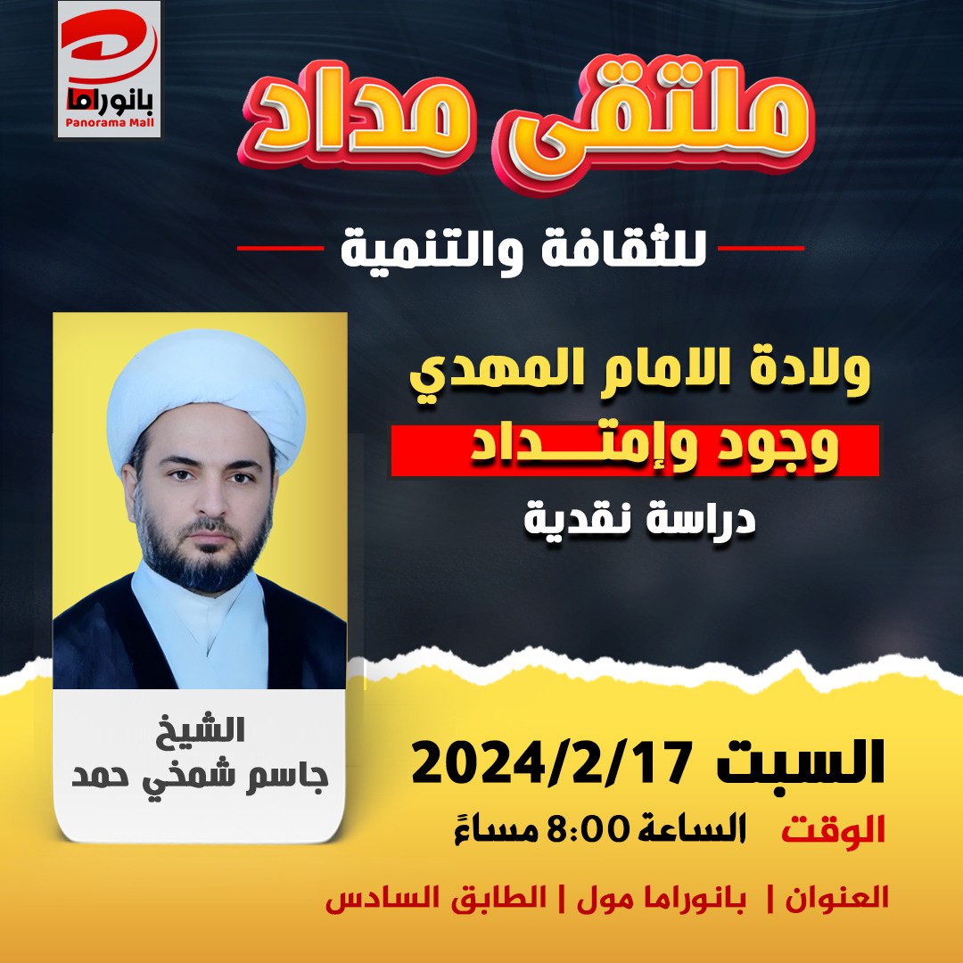 في إطار التفاعل الثقافي والعلمي بين الأكاديميين والمثقفين، نظم ملتقى مداد للثقافة والتنمية بالتعاون مع كلية العلوم الإسلامية ندوة علمية بعنوان "ولادة الإمام المهدي وجود وامتداد دراسة نقدية". أقيمت الندوة في يوم السبت 17 فبراير 2024 في الساعة 8 مساءً، وذلك في بانوراما مول _ الطابق السادس.