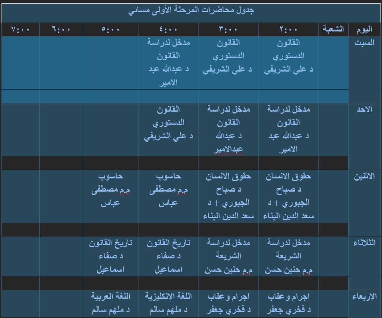 ترحب كلية القانون بالطلاب الجدد وتتمنى لهم عاماً دراسياً مميزاً ومليئاً بالنجاح والتفوق وتود اعلامها بان موعد بدأ الدوام الرسمي يوم السبت الموافق 7/12/2024 وكما موضح في الجدول الاسبوعي