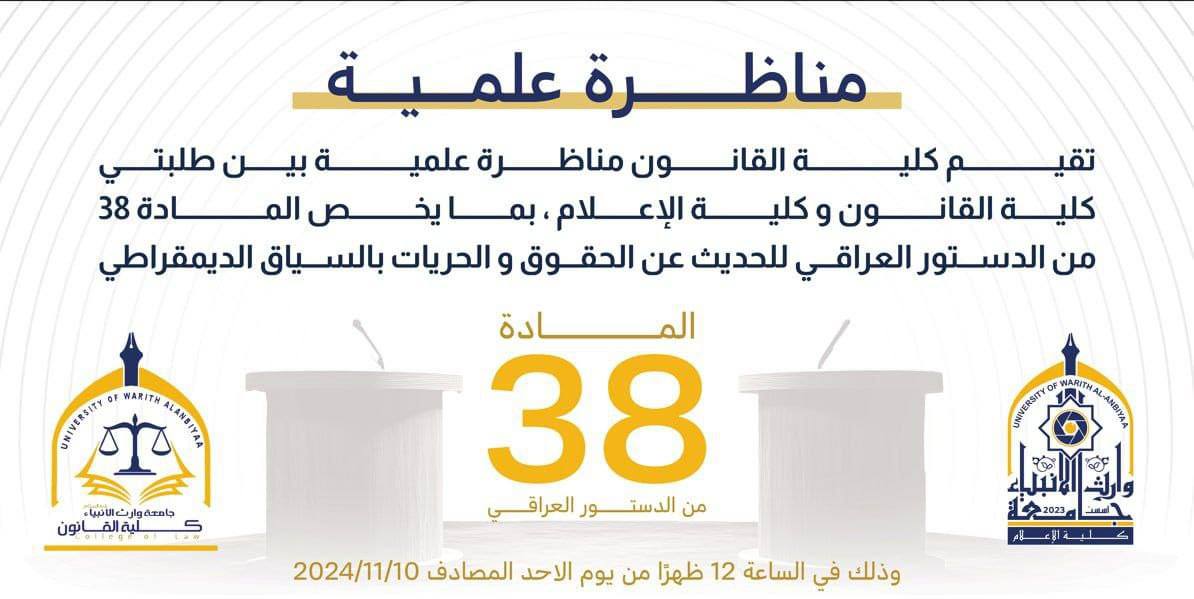 اجريت على قاعات كلية القانون مناظرة علمية بين طلبتها وطلبة كلية الإعلام هي فرصة رائعة لاستعراض وجهات النظر المختلفة حول موضوعات تتعلق بالقانون والإعلام، وتبادل الأفكار والتفاعل بين الطلاب من مختلف التخصصات. مثل هذه المناظرات يمكن أن تكون غنية ومثرية، حيث يتناول المشاركون موضوعات قانونية وإعلامية مشتركة أو متقاطعة.
