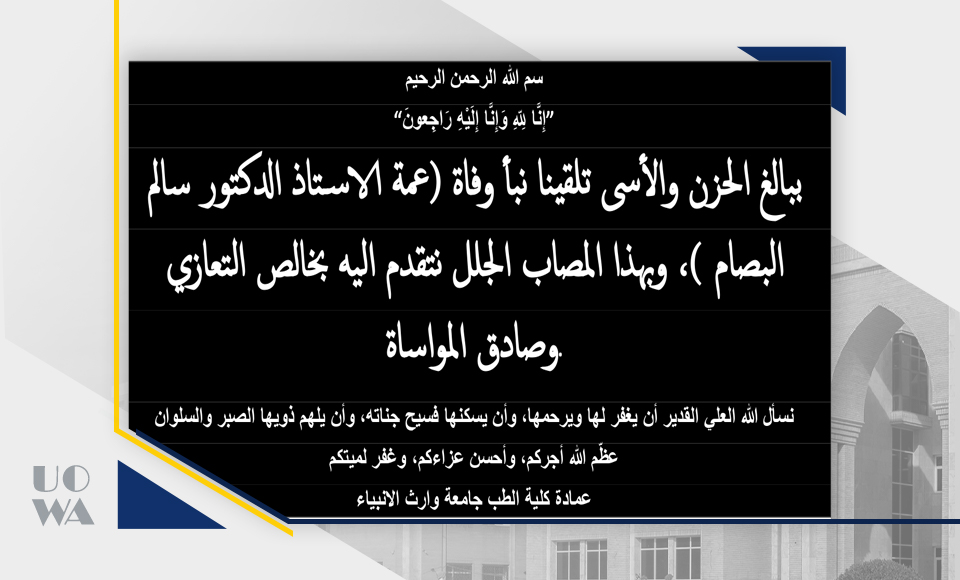 بسم الله الرحمن الرحيمإِنَّا لِلَّهِ وَإِنَّا إِلَيْهِ رَاجِعونَ“يبالغ الحزن والأسى تلقينا نبأ وفاة (عمة الاستاذ الدكتور سالم البصام )، وبهذا المصاب الجلل نتقدم اليه بخالص التعازيوصادق المواساةنسأل الله العلي القدير أن يغفر لها ويرحمها، وأن يسكنها فسيح جناته، وأن يلهم ذويها الصبر والسلوانعظم الله أجركم، وأحسن عزاءكم، وغفر لميتكمعمادة كلية الطب جامعة وارث الانبياء
