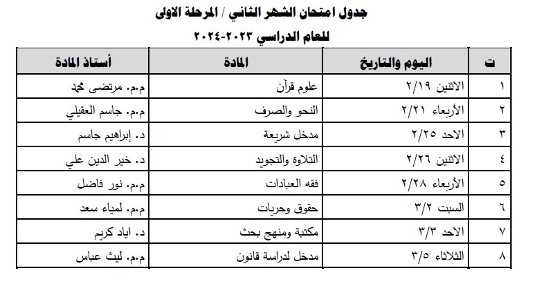 جدول امتحانات الشهر الثاني للفصل الأول المرحلة الأولى من العام الدراسي 2023-2024 قسم الفقه وأصوله