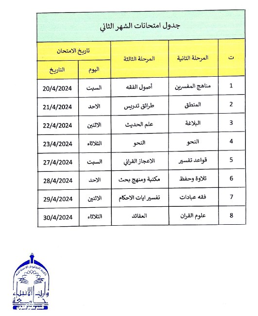 نرفق لكم جدول امتحانات الشهر الثاني للفصل الثاني من العام الدراسي 2023-2024 و للمراحل الثانية و الثالثة مع التعليمات الامتحانية متمنين لكم دوام التوفيق و النجاح.