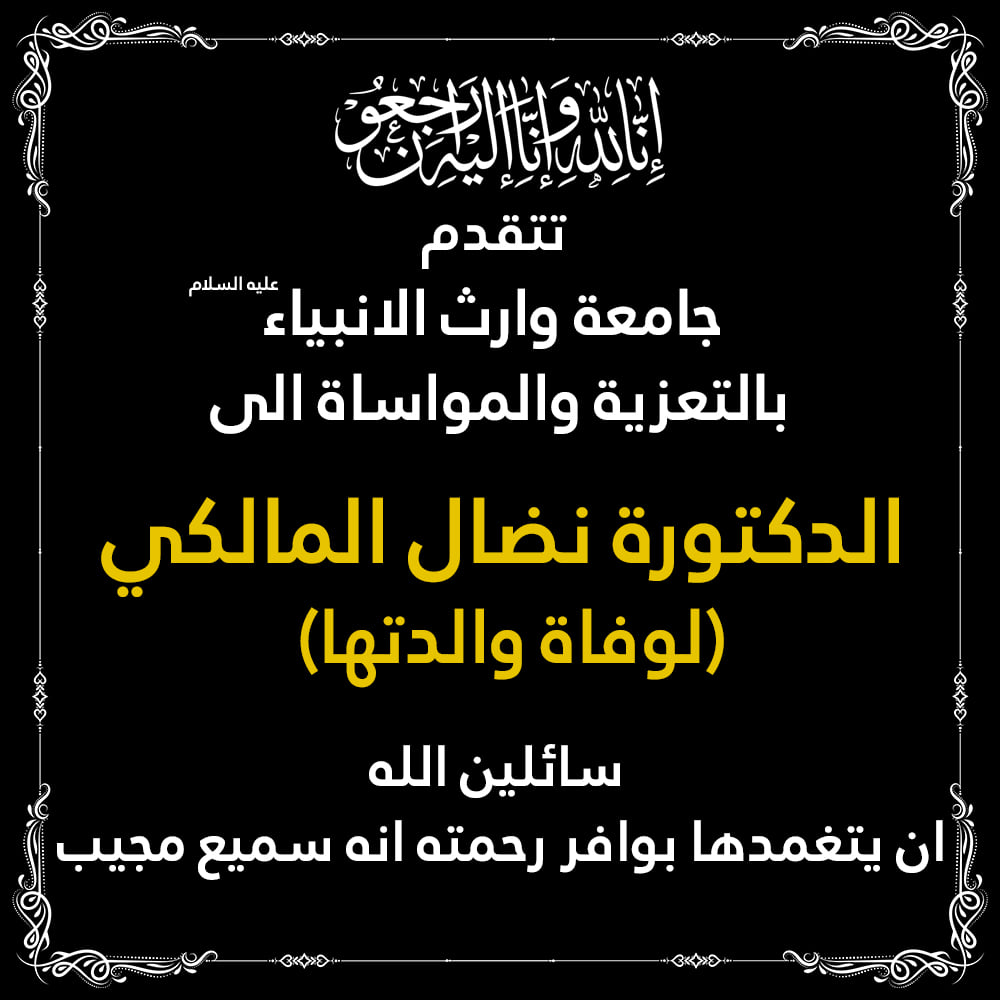 تتقدم جامعة وراث الأنبياء (عليه السلام) بالتعزية والمواساة الى الدكتورة نضال المالكي لوفاة والدتها سائلين الله أن يتغمدها بوافر رحمته إنه سميع مجيب