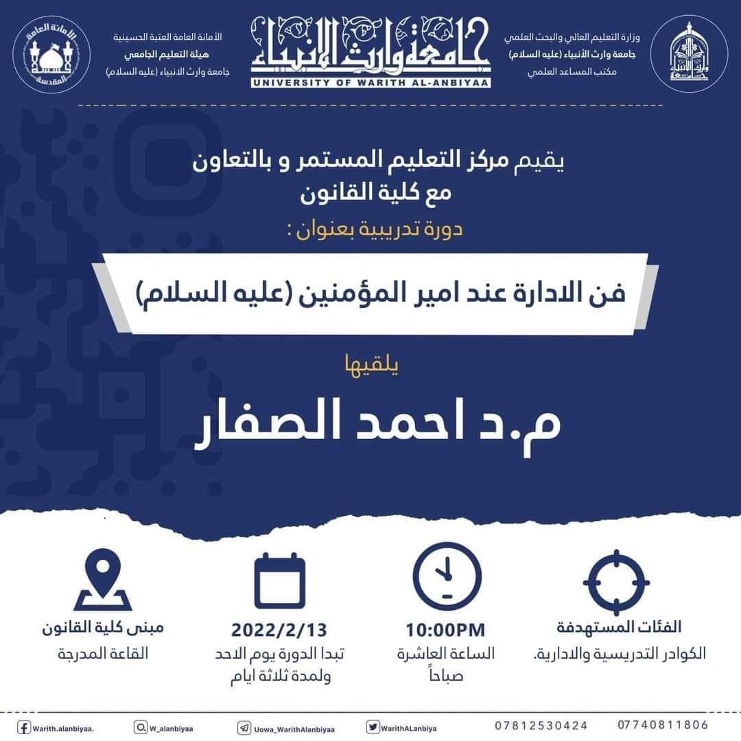 تزامنا مع ذكرى ولادة امير المؤمنين الامام علي (عليه السلام) نضم مركز التعليم المستمر في جامعة وارث الانبياء (عليه السلام) بالتعاون مع كلية القانون اليوم الاول من دورة "فن الادارة عند امير المؤمنين (عليه السلام)" والتي حاضر فيها من كلية القانون الدكتور احمد الصفار.علما ان الدورة تستمر ليومي الاثنين والثلاثاء الموافق 2022/2/15,14 على قاعة الامام الحسين (عليه السلام)/ كلية القانون في تمام الساعة العاشرة صباحا ولجميع الراغبين في الحضور.