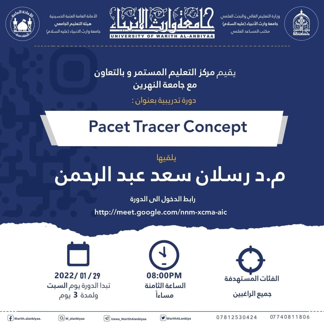 *تقام اليوم الاثنين الموافق 2022/2/14 في تمام الساعه (8:00) مساءً ولمدة ثلاثة أيام. *يحاضر في الدورة (م.د رسلان سعد عبد الرحمن). التدريسية في كلية الهندسة/ جامعة النهرين* للانضمام الى الدورة يرجى الدخول على الرابط ( https://meet.google.com/uzk-bsbx-cox). *يحصل المشاركون على شهادات مشاركة معتمده صادره عن مركز التعليم المستمر في جامعة وارث الانبياء (عليه السلام). *لمتابعة اخبار المركز يرجى الاشتراك في القناة ( https://t.me/clcuowa).