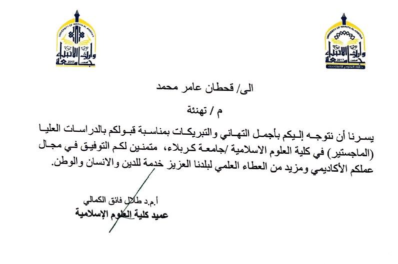 تتقدم كلية العلوم الإسلامية في جامعة وارث الأنبياء بأحر التهاني والتبريكات لخرّيجيها المتميزين ياسمين محمود وقحطان عامر بمناسبة قبولهما في الدراسات العليا الماجستير بجامعة كربلاء.
