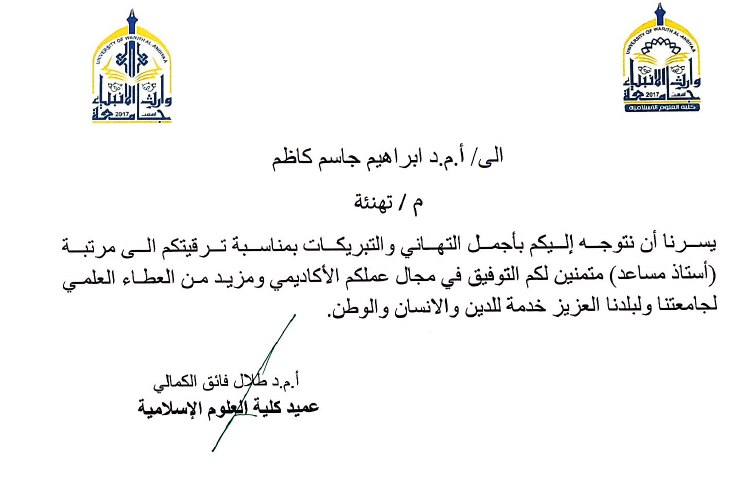 تتقدم كلية العلوم الإسلامية في جامعة وارث الأنبياء بأسمى آيات التهاني والتبريكات إلى التدريسي الدكتور إبراهيم جاسم كاظم جعفر الموسوي بمناسبة منحه لقب الأستاذ المساعد.