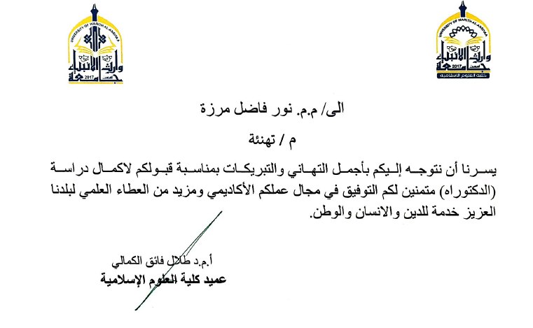 تتقدم عمادة كلية العلوم الإسلامية في جامعة وارث الأنبياء بأحر التهاني والتبريكات إلى التدريسية م.م نور فاضل مرزة الجبوري بمناسبة قبولها في الدراسات العليا الدكتوراه بجامعة كربلاء.