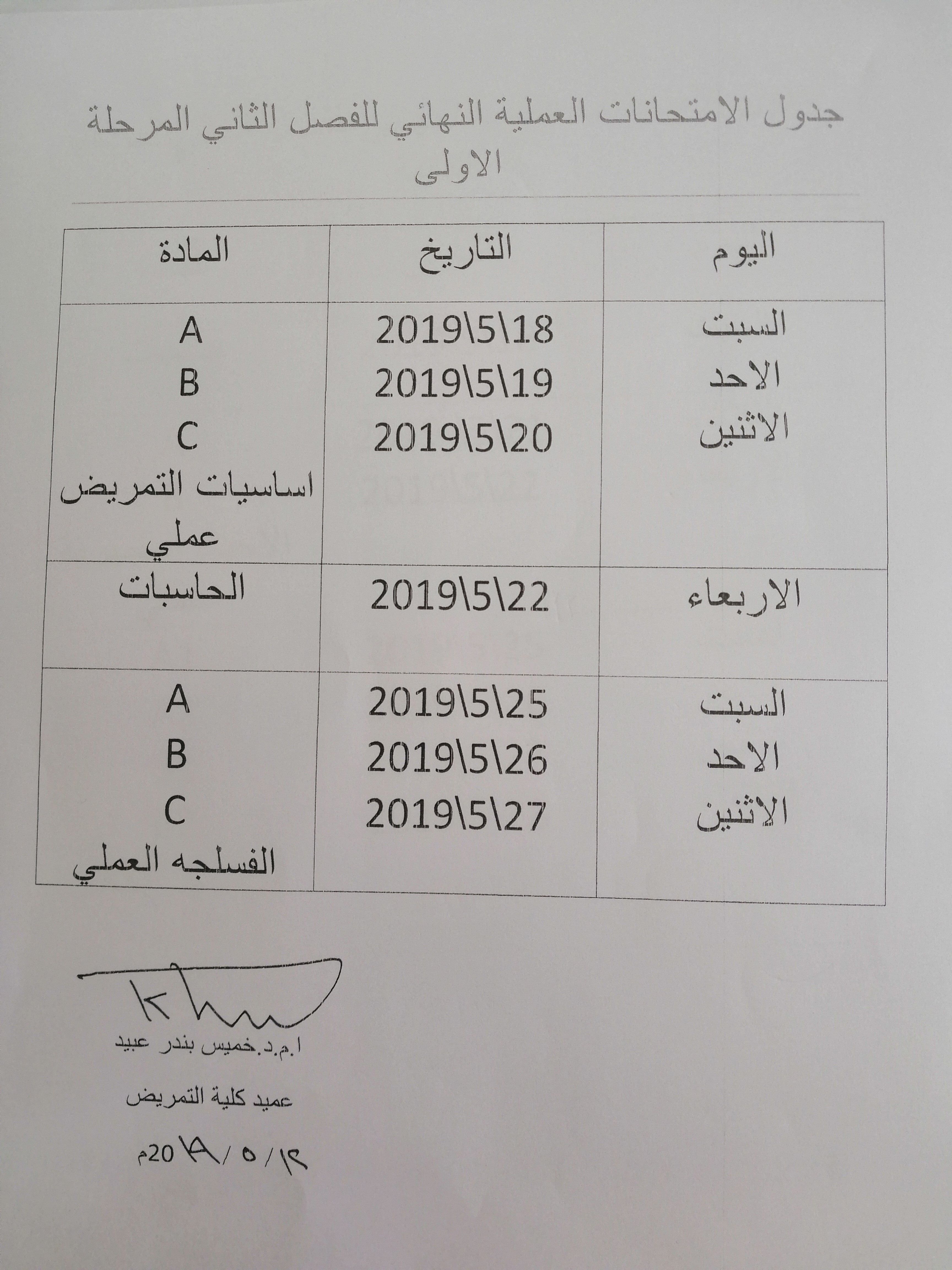 جدول امتحانات العملي النهائي للمرحلتين الاولى والثانيه ٢٠١٨/٢٠١٩