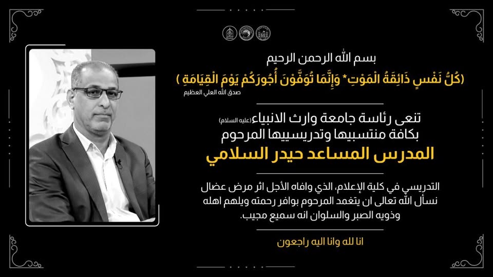 تعزية جامعة وارث الأنبياء بوفاة (المدرس المساعد حيدر السلامي)