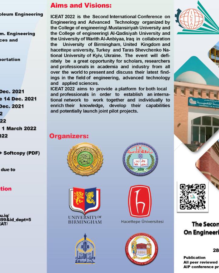 حرصاً على ديمومة التعاون العلمي بين مؤسسات التعليم العالي في العراق ولما تمتلكه الجامعة من قامات علمية وأكاديمية،انضمت جامعة وارث الانبياء(عليه السلام) الى الهيئة التنظيمية للمؤتمر الدولي الثاني للهندسة والتقنيات المتقدمة(ICEAT-2022) ،الذي ستقيمه كلية الهندسة بجامعة القادسية ،وبمشاركة كلية الهندسة بالجامعة المسنتصرية ،إضافة الى جامعات دولية اخرى (جامعة حجة تبه التركية و جامعة برمنكهام البريطانية وجامعة كييف الوطنية)،حيث سيعقد المؤتمر افتراضياً بسبب ضروف الجائحة في العاصمة التركية إسطنبول بتاريخ٢٨ -٢٩ / ٣/ ٢٠٢٢وسيتم نشر كافة البحوث في مجلة AIP المفهرسة ضمن مستوعبات سكوبس.بإمكان السادة الباحثين المشاركة بالمؤتمر ببحوثهم العلمية القيمة عبر الروابط الآتية:رابط المؤتمرhttps://uomustansiriyah.edu.iq/web_page.php?page_id=2899...رابط قناة التلكرام للاجابة على استفسارات الباحثين الاعزاءhttps://t.me/+aEWuEsX8uk8zZjAyرابط المشاركة كمقيم في المؤتمرhttps://surveyheart.com/for