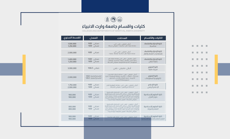 الرسوم: 100,000 دينار عراقي، تدفع في قسم الشؤون المالية بجامعة وارث الأنبياء.