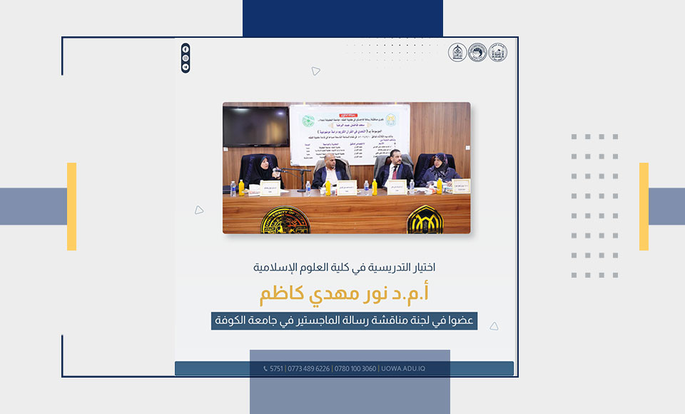 تم اختيار الأستاذ المساعد الدكتورة نور مهدي كاظم، التدريسية في قسم علوم القرآن بكلية العلوم الإسلامية في جامعة وارث الأنبياء (عليه السلام)، عضواً في لجنة مناقشة رسالة ماجستير لأحد طلبة الدراسات العليا في جامعة الكوفة.